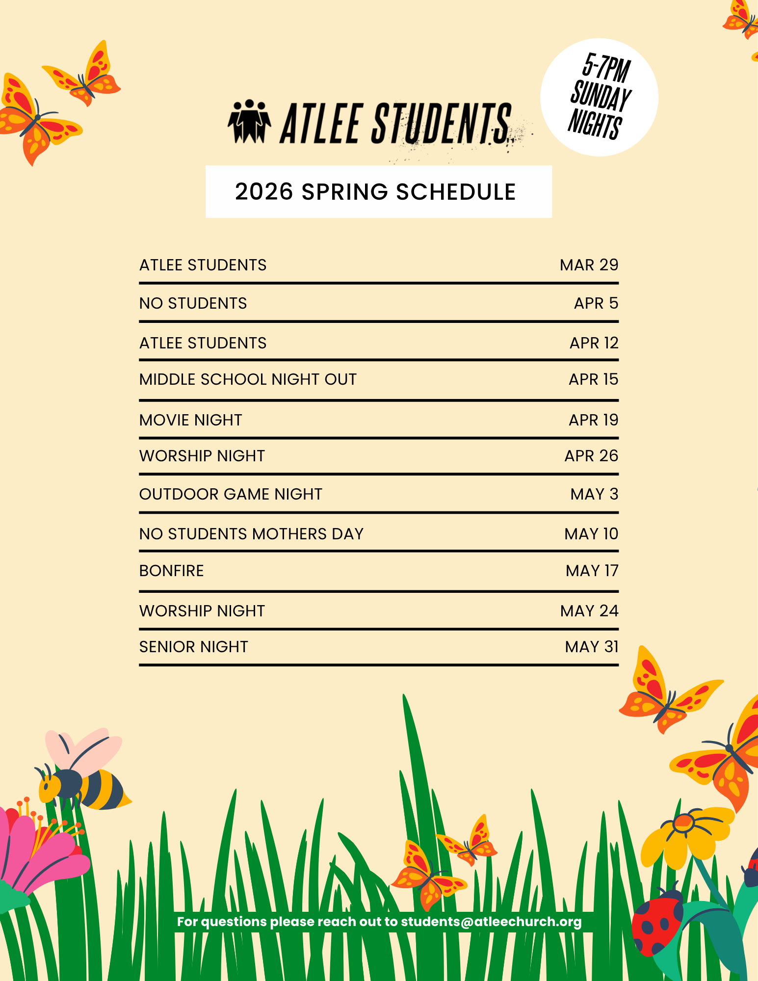 We aspire to create an environment where students feel loved, supported, and empowered to pursue God's calling in their lives, impacting the world for His glory. Atlee Students meets every Sunday night from 5-7 pm.
